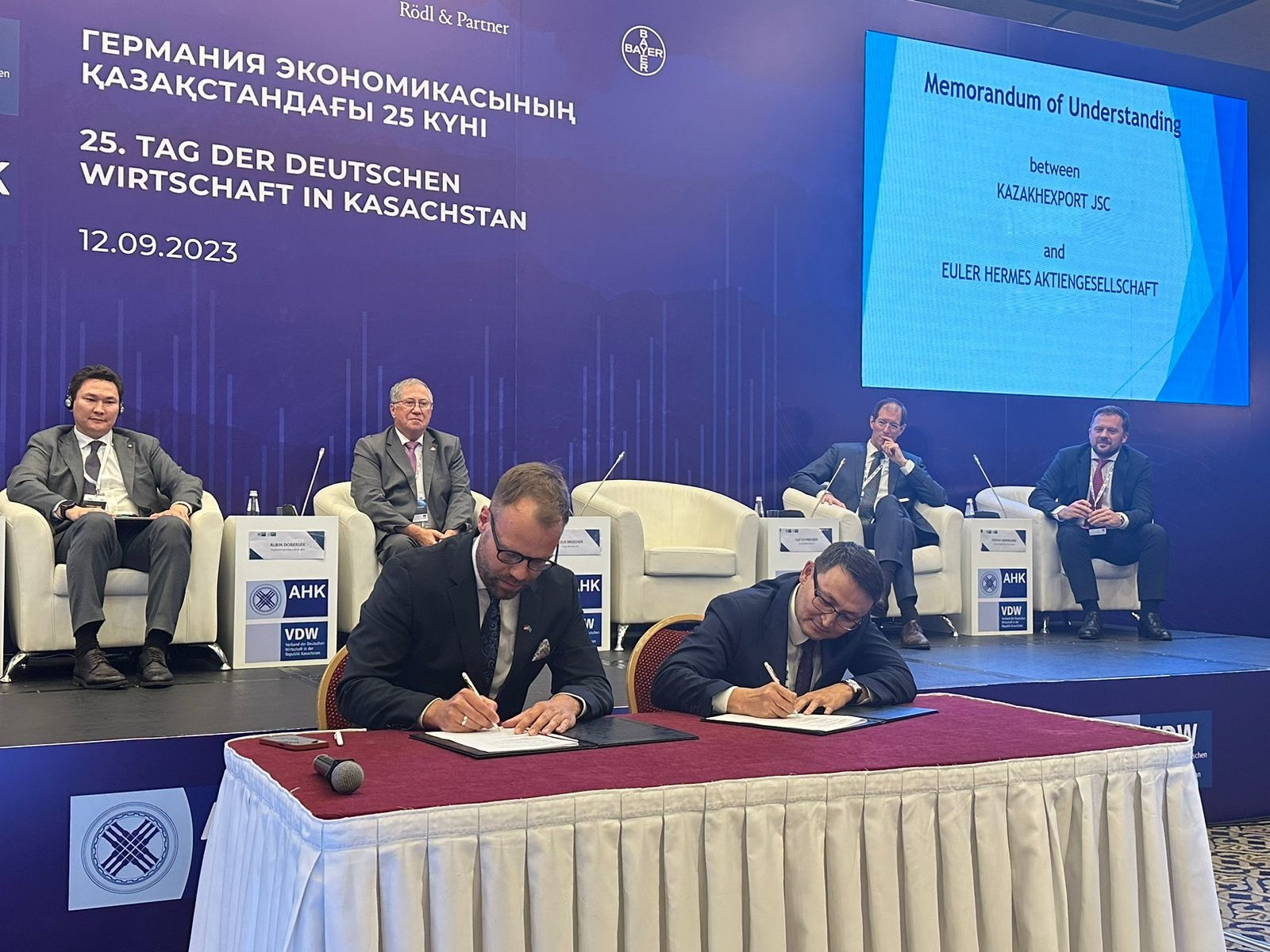 В рамках мероприятия делегации KazakhExport и Euler Hermes также провели ряд двусторонних встреч в формате b2b. Отметим, что церемония подписания состоялась на конференции «25-й День германской экономики в Казахстане», организованной представительством германской экономики в Центральной Азии совместно с Союзом германской экономики в Республике Казахстан.